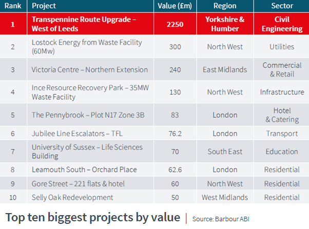 The latest edition of the Economic & Construction Market Review from industry analysts Barbour ABI, highlights the levels of construction contract values awarded in November across Great Britain. Infrastructure was the dominant sector of the month, totalling £3.7 billion based on a three-month average and is the highest post-recession figure, majorly influenced by the aforementioned TransPennine upgrade, which is more than seven times the value of the next largest infrastructure contract on the month (see figure 1.1 below).