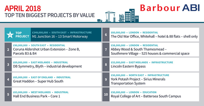 The latest edition of the Economic & Construction Market Review from industry analysts Barbour ABI highlights levels of construction contract values awarded across Great Britain. The top project for the month was the ‘M1 Junction 16- 13 Smart Motorway upgrade’ valued at £349 million, almost four times the value of the next biggest project (see table).