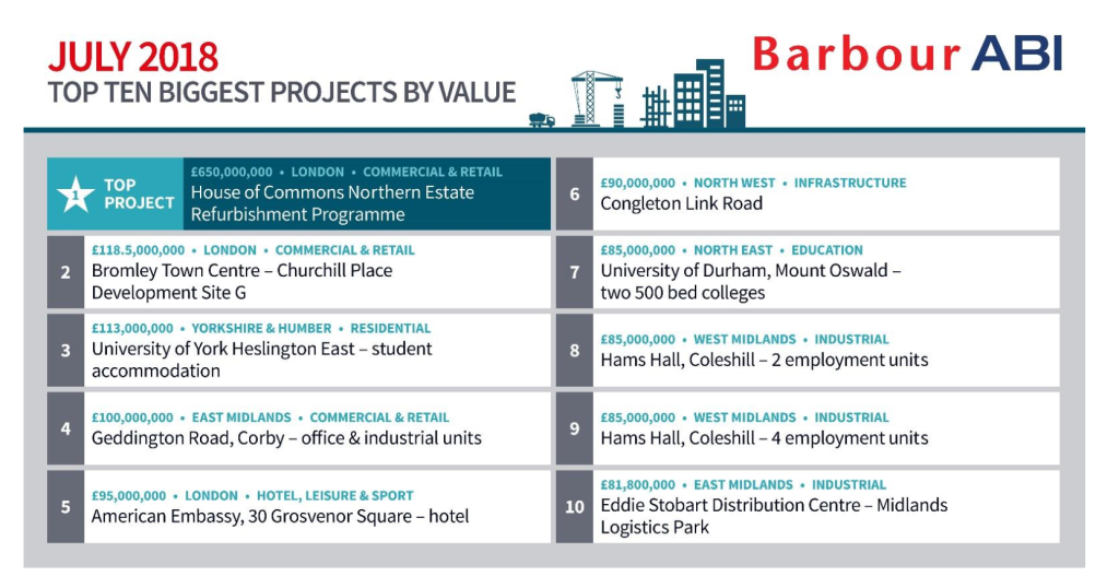 The latest edition of the Economic and Construction Market Review from industry analysts Barbour ABI highlights levels of construction contract values awarded across Great Britain. The largest project in July was the £650m House of Commons Northern Estate Refurbishment Programme (see table above), more than five times the value of the second largest project on the month. With only four of the top ten largest projects having a value of over £100 million, there is a distinct lack of ‘mega projects’ that the sector is typically accustomed to.