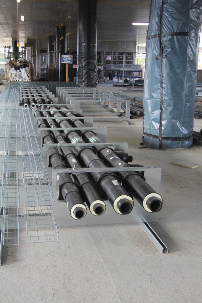 This new solution – suitable for chilled water, glycol, saline or alcohol – features factory insulated polyethylene (PE) pipe in a full range of diameters, which are then encased in HDPE or stainless steel outer pipe to offer long-term protection and rigidity. The integral insulation (GFHE) not only reduces energy losses, but counters the build-up of condensation and mould growth. The boilers are being installed on top of one building with the second housing in a chilled plant room while, internally, Allied Mechanical Services’ operatives assembled the main pipe runs as 375 separate modular units, each six metres in length. These are then suspended from racks anchored to the structural soffits.