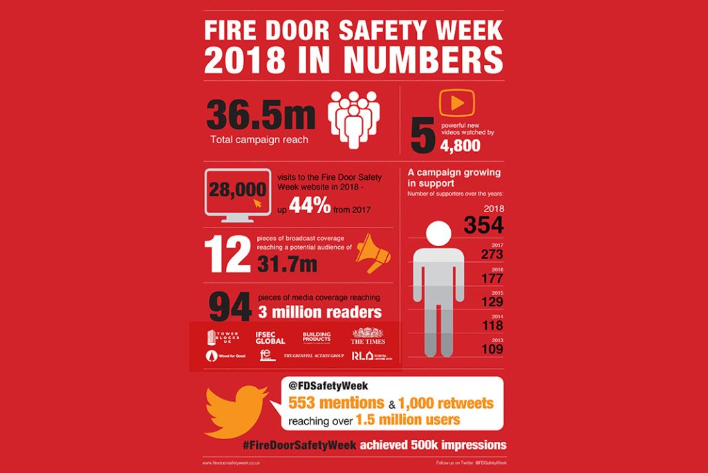 The award-winning Fire Door Safety Week campaign reached a new high in 2018, gaining support from more than 350 individuals, organisations and businesses, and reaching millions through press coverage and social media activity.