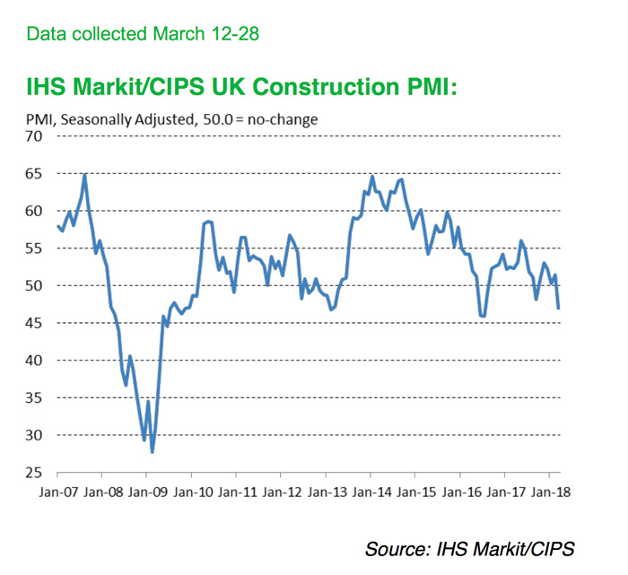 The seasonally-adjusted IHS Markit/CIPS UK fell sharply from 51.4 in February to 47.0 in March, to register below the 50.0 no-change threshold for the first time in six months. Moreover, the latest reading signalled the fastest overall decline in construction output since July 2016. Where a drop in work was reported, survey respondents noted that unusually bad weather had disrupted staff availability and activity on site.