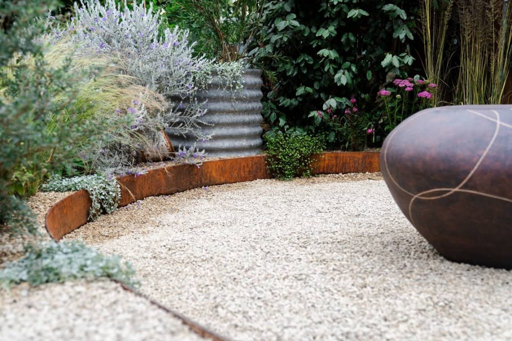 This showstopper featured over 20 metres of Straightcurve Flex Garden Edging in weathered steel finish to create beautiful curved pathways, adding a touch of elegance.