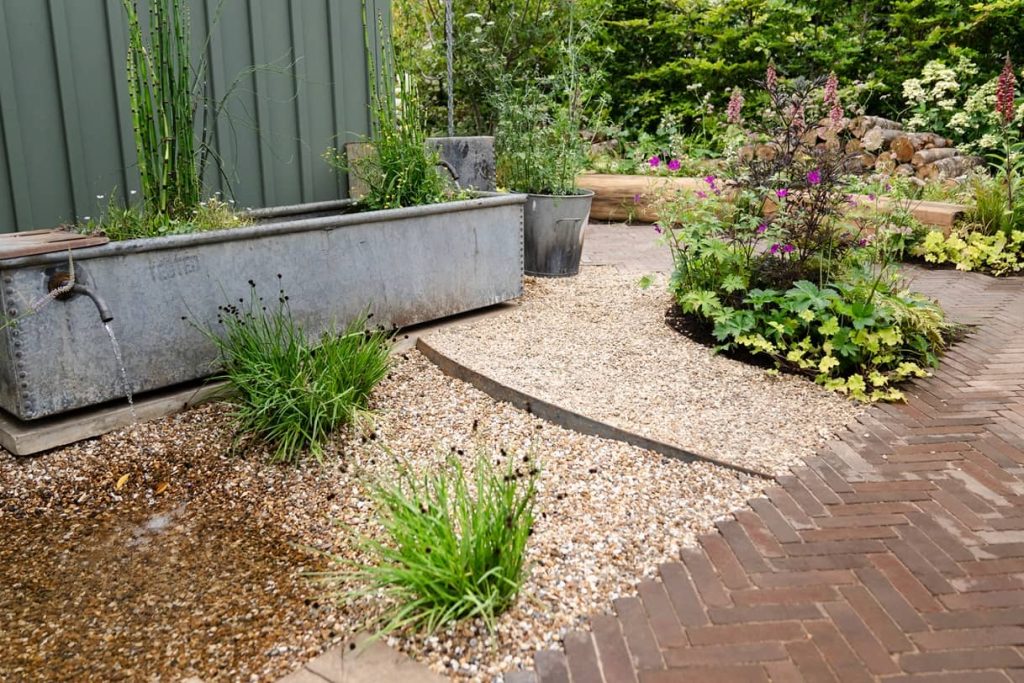 Recycled gravel gardens create natural soakaways for heavy rainfall, while drought-tolerant plants and gravel mulch further minimise water needs.