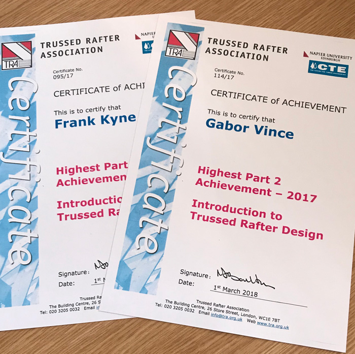 Two beneficiaries of the training programme are Gabor Vince, from Taylor Lane Timber Frame, and Frank Kyne, from Wyckham Blackwell, who are the highest scorers for the Introduction to Trussed Rafter Design online course.