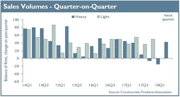 - A balance of 15% of heavy side firms reported that construction product sales fell in the first quarter of 2018 compared with the fourth quarter of 2017. No light side firms, on balance, reported a rise in sales in Q1